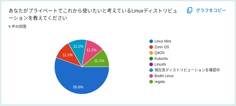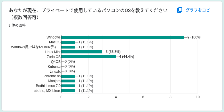 アンケート結果では、実際に使用されているLinuxディストリビューションはZorinOSの方がLinuxMintよりも1票多いですが、やはりこの2つは人気があることに間違いありませんでした
